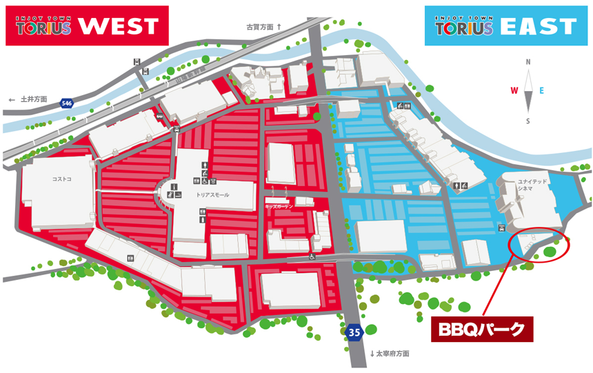 バーベキューパークは久山のトリアスモール内のイーストエリア、ユナイテッドシネマさんの横にあります。