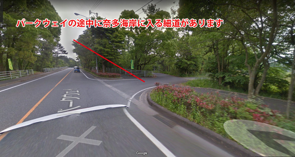 国道59線と交わる海岸沿いのパークウェイという道路を進み志式神社を通り越すと右手側に奈多海岸へ抜けることができる細道がありますのでそちらからお入りください。