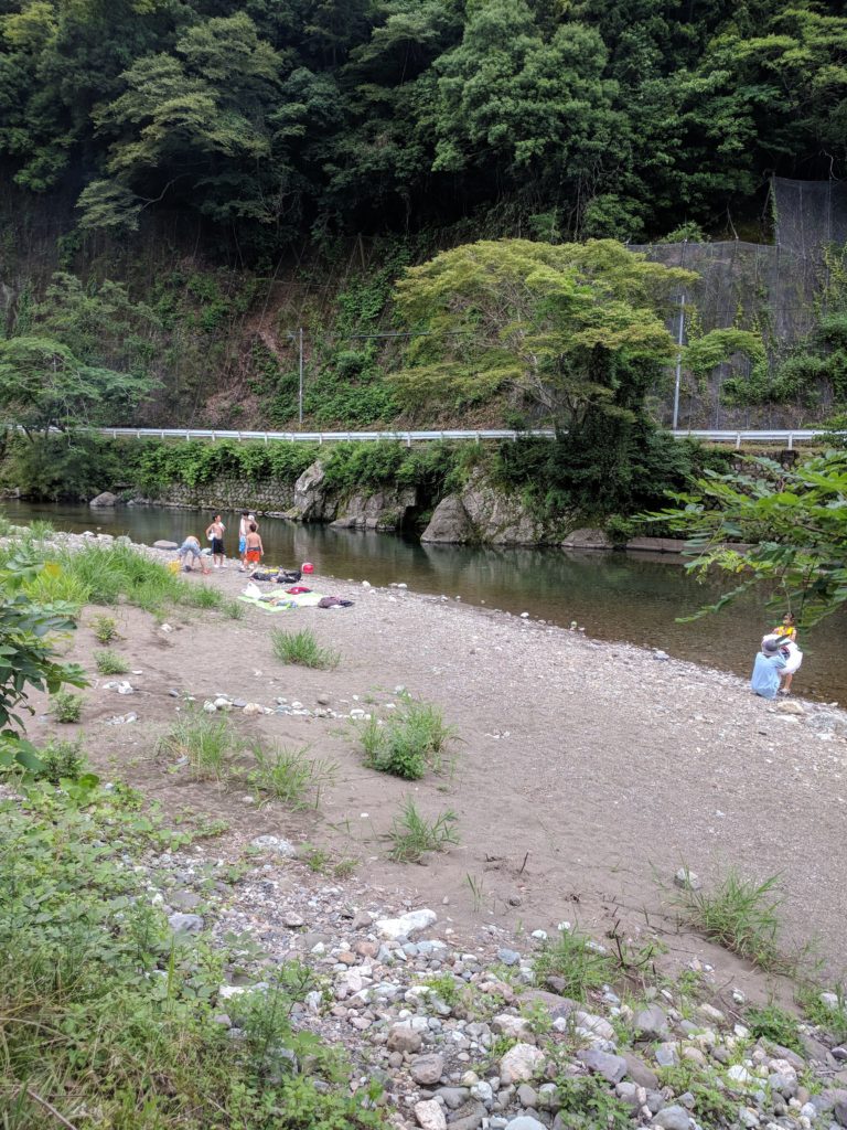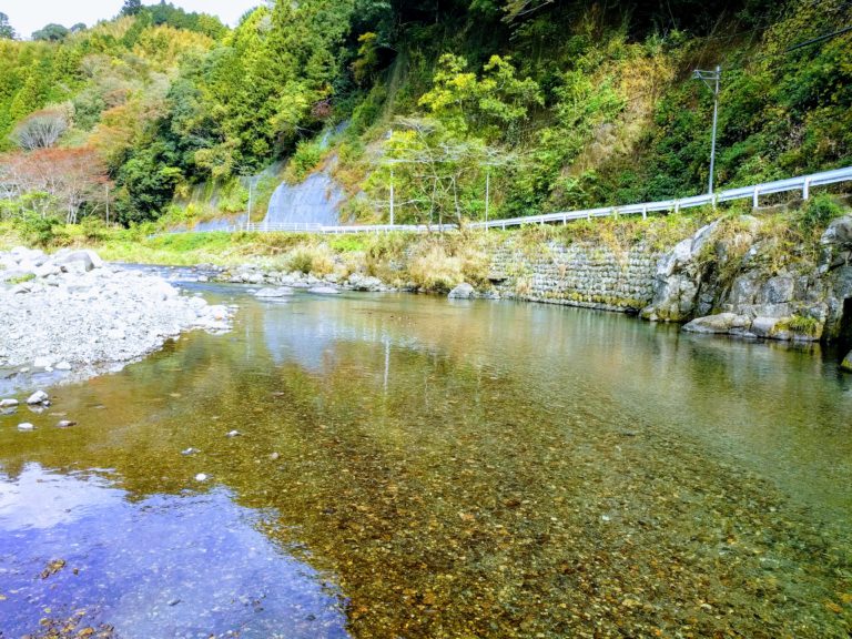 興津川沿いの県道196号線を土村キャンプ場付近から1kmほど奥に進むと右手に「西里キャンプ適地」の看板が見えてきます。進むと無料駐車場があり川沿いに降りて行けば透き通った興津川の清流です。