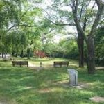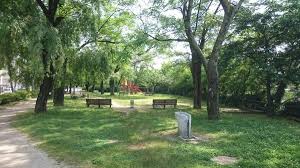 西十日市公園前・河川敷/広島市中区は、木陰もあり、涼しい場所で、滑り台やブランコなどの遊具もあります。お花見の季節には、たくさんの桜が咲き、にぎわいます。