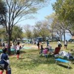 滋賀県草津市の都市公園湖岸緑地、山田新浜地区は、車道横にはきちんと整備された歩行者自転車専用道路があり、琵琶湖岸に沿って快適なサイクリングが楽しめます。また、道路と琵琶湖の間にはいくつもの公園が整備されており、土日ともなればたくさんの家族連れで賑わっています。琵琶湖湖岸にいくつか点在する公園の中の1つで、バーベキューが楽しめる公園で、休日や夏休みになれば芝生の広場でBBQコンロやターフなど準備してお気に入りの食材でバーベキュー楽しまれている家族連れやグループをよく見うけられます。但し、直火は禁止ですのでおきおつけ下さい。また、園内では多数のイベントが開催されており、家族で参加できるイベントが開催されるときは、多くの家族連れで大いに賑わいを見せています。多目的広場では弁当を広げてピクニックを楽しんでいる方々もおられます。トイレは水洗で男女別が完備です。