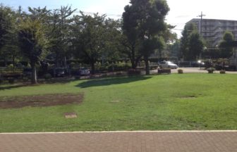 まずは上記の駐車場に車を止めて画像左側の方からグラウンド沿いに歩き、左手に見える芝生広場がバーベキューができるエリアになります。木が生えているので日よけにもなります。